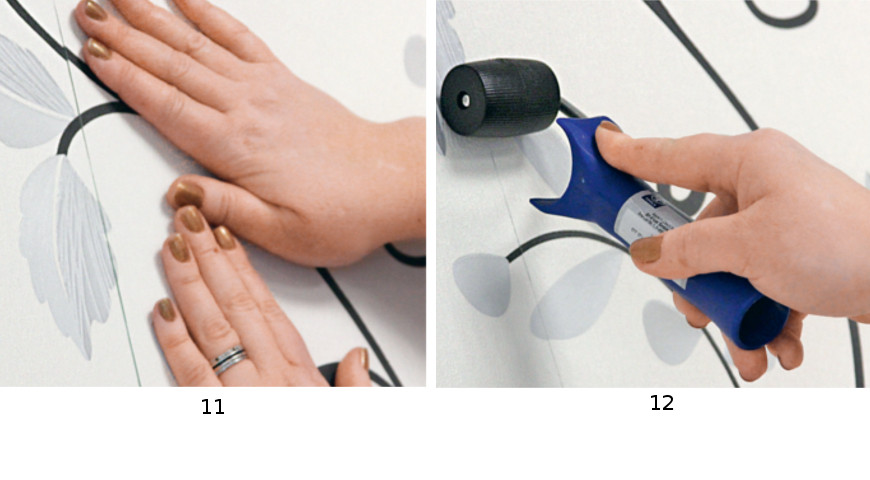 На тисненых обоях шов часто остается заметным даже при полном совмещении рисунка. Используйте стыковочный валик, чтобы обработать шов качественно. Разгладьте обои валиком вдоль стыков. Проводите по одному месту несколько раз со средней степенью нажима, но не давите слишком сильно, чтобы не нарушить фактуру тиснения (12).