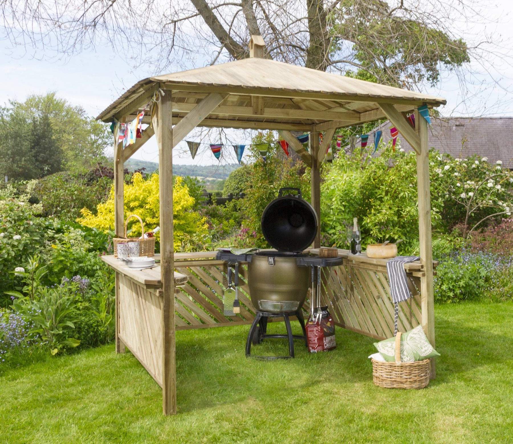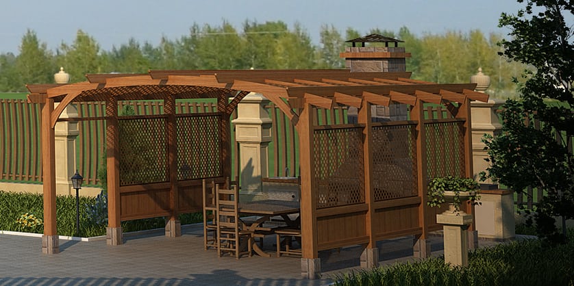 Деревянные из бруса, оцилиндрованного бревна, стволов деревьев. Такие сооружения прекрасно вписываются в любой ландшафтный дизайн. Построить деревянный навес для барбекю своими руками достаточно просто, не требуется специальных навыков и оборудования, материал легко обрабатывается бытовыми инструментами. К недостаткам можно отнести недолговечность, пожароопасность и гниение дерева, его поражают грибки, отдельно подчеркнем уязвимость перед грызунами и насекомыми. Чтобы продлить срок эксплуатации и сохранить эстетику, деревянный каркас для навеса барбекю необходимо тщательно обработать огнестойкими и антисептическими средствами, дополнительно прогрунтовать и покрасить.