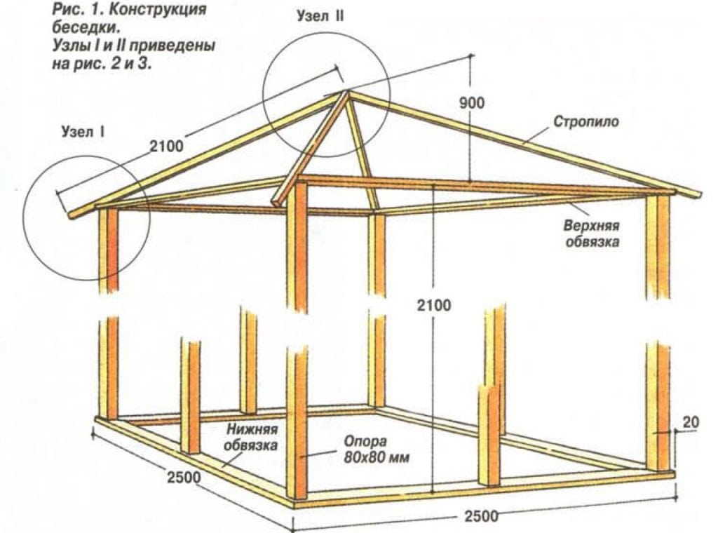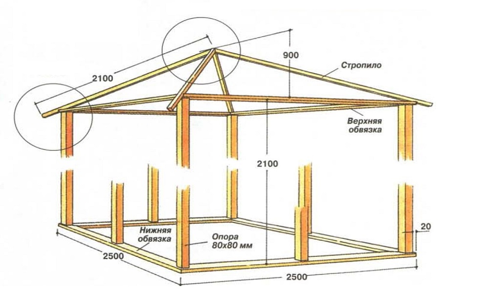 Более красивый вариант с четырехскатной шатровой крышей требует сборки стропил: из четырех соединенных в одном конце брусьев (70-80 мм толщиной), которые крепятся по краям каркаса. Дополнительно их можно укрепить обрешеткой. Далее на установленные стропила монтируется крыша.