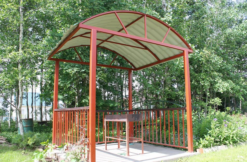 Навес над мангалом, фото переносной сварной конструкции из круглой трубы и профнастила