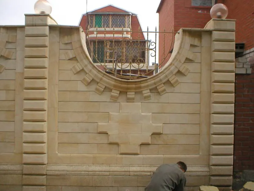 M15 (15 кгс/см²). Камень отличается наибольшей пористостью, невысокой плотностью и весом. Светло-желтый материал подходит для возведения одноэтажных строений и ограждений.