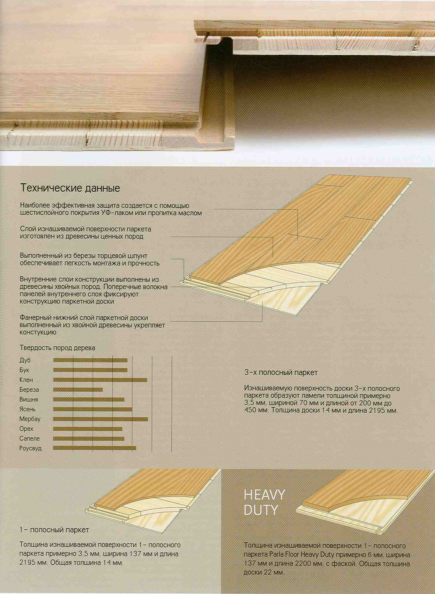Натуральное дерево не всегда является самым крепким материалом. Для внешнего слоя паркета обычно используют такие прочные и благородные породы как дуб – лидер по прочности, бук – светлый и нежный, поэтому любимый материал для детских комнат, вишню – богатую оттенками, орех – износостойкий и неприхотливый, клен – менее элитный, но достаточно прочный. Для нижнего слоя обычно используют сосну или ель – натуральные, теплые, но уязвимые к истиранию. Если же использовать сосну в качестве внешнего слоя, пол будет красивым, натуральным, но быстрее износится. Есть ряд особенностей и относительно лиственницы – такие особенности древесины как склонность к трещинам и пористость могут обернуться как в плюс, так и в минус.