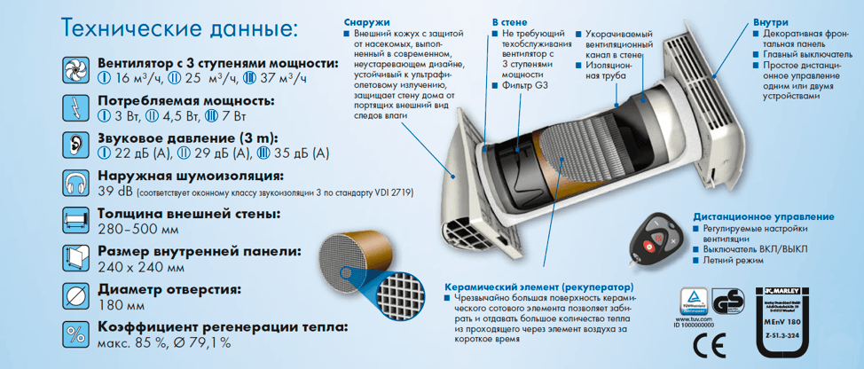 Для монтажа в стене необходимо проделать отверстие диаметром 18 см. Благодаря простоте монтажа рекуператор удобен в сервисе. Управление проводится с помощью дистанционного пульта.