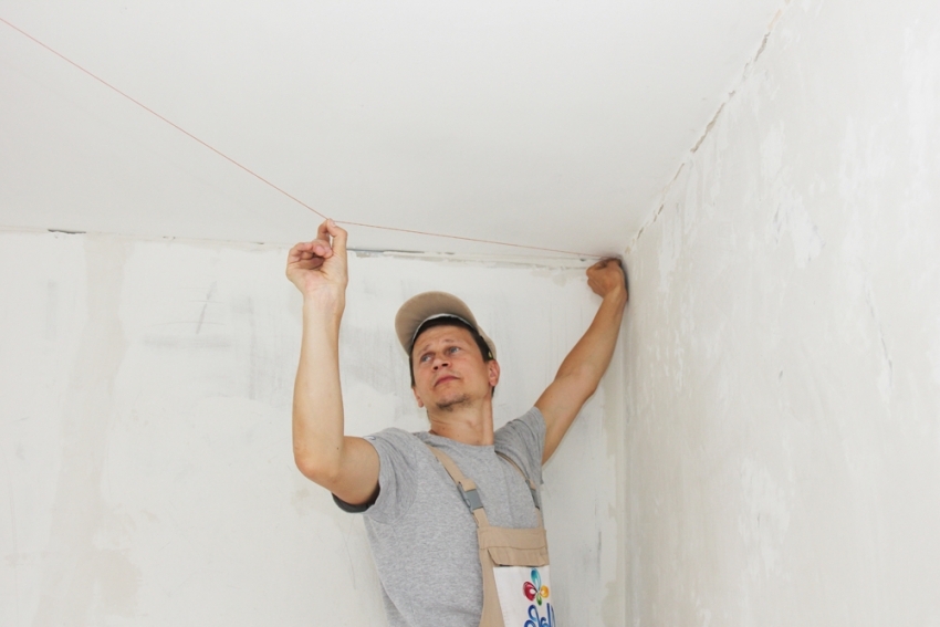 Проведение меловой линии на потолке для поклейки первого обойного листа