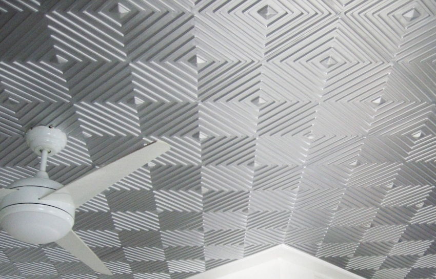 При укладке потолочной плитки из пенопласта по диагонали можно получить необычное облицовочное покрытие, которое не только добавит оригинальности в интерьер, но и умело позволит скрыть небольшую кривизну стен.