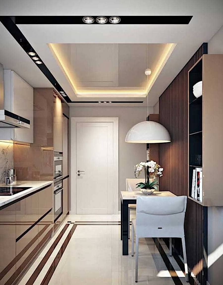 - От размеров помещения и его высоты. В невысокой комнате подвесная конструкция потолка «поглотит» минимум 10 см, но позволит скорректировать геометрию узкого или слишком широкого пространства. Глянцевые поверхности отражают свет и зрительно увеличивают помещение, а матовые мягко рассеивают световые лучи;