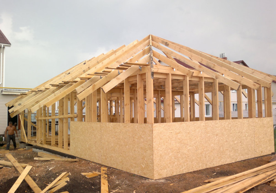 Делают из доски, цельного или клееного бруса (который является самым прочным, качественным и дорогим), а также деревянной двутавровой балки (дерево + ОСП + дерево). Стандартное сечение стойки — 50 х 150 мм. От качества дерева зависит долговечность и прочность дома. Главное требование — влажность пиломатериалов должна быть не выше 18%. Дома с деревянным каркасом наиболее распространены.