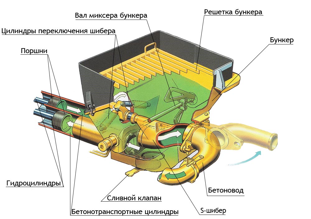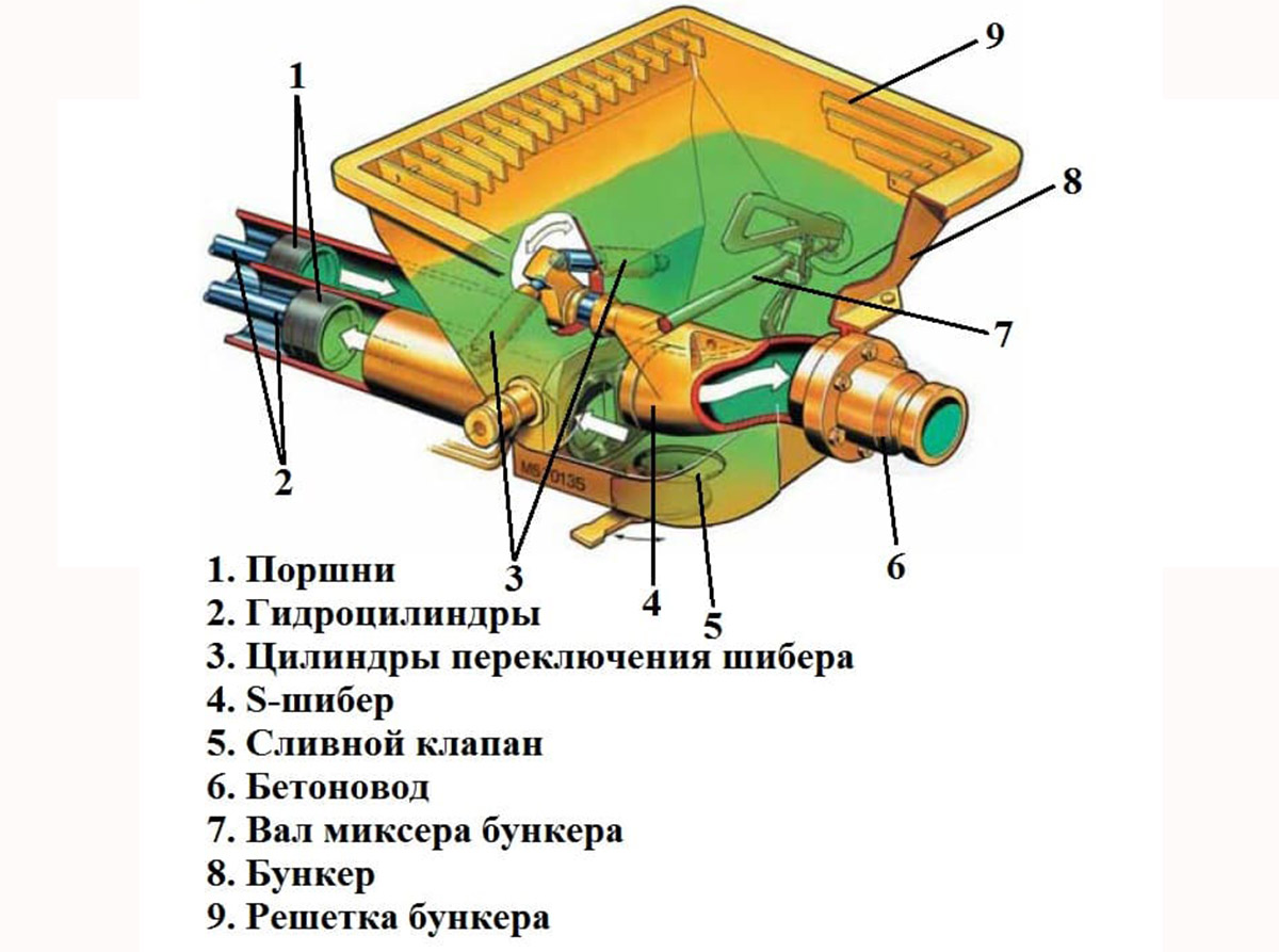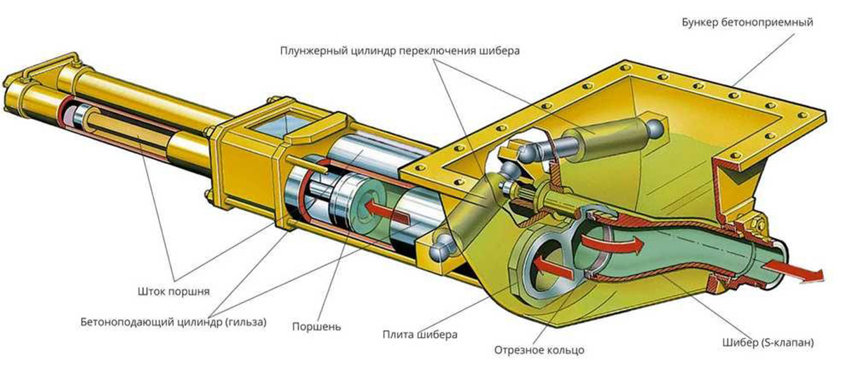 Цилиндр и приемник насоса связываются между собой с помощью заслонки, которая открывается при обратном ходе поршня, что обеспечивает поступление бетонной смеси. Если наблюдается прямой ход поршня, то это приводит к выталкиванию в бетонопровод смеси.