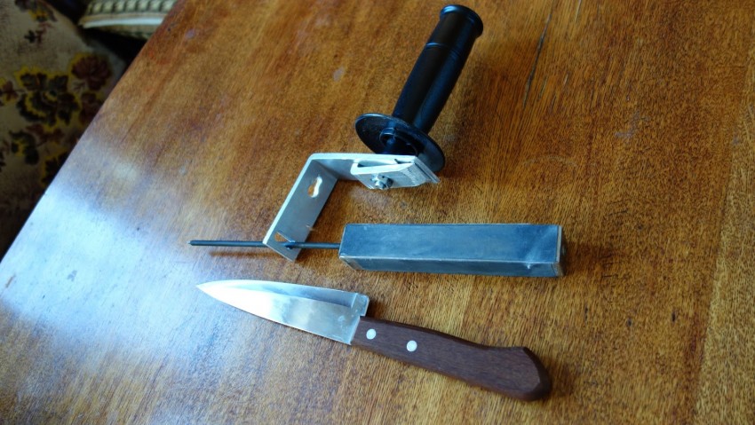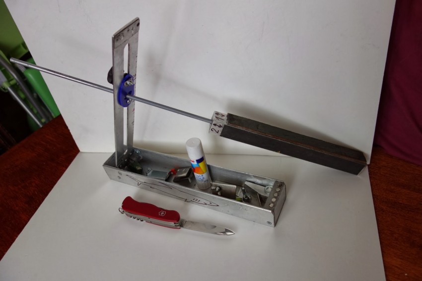 Устройство представляет собой опорный стол, на котором закрепляется нож. На противоположном конце стола вертикально закреплена винтовая стойка с планкой. В эту планку вставляется направляющий стержень, на котором монтируется абразивный брусок. Методом передвижения планки по винтовому стержню можно изменить величину угла обработки металла.