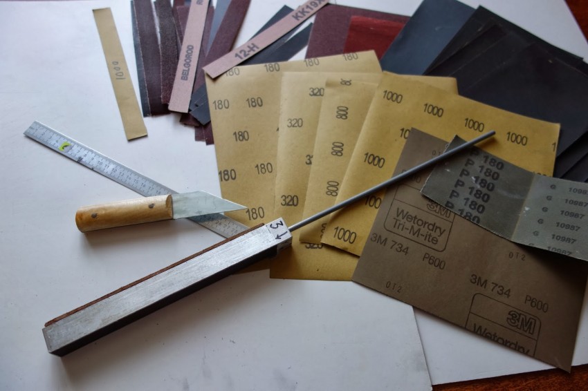 В качестве абразивных брусков можно использовать уже готовые изделия, которые можно приобрести в хозяйственном магазине либо изготовить их самостоятельно. Для этого используют небольшие прямоугольные пластины из стекла, толщиной 4-5 мм. При помощи двустороннего скотча на их поверхность наклеивается наждачная бумага разной зернистости. Себестоимость таких брусков весьма низкая, а наждачную бумагу можно в любой момент заменить новой