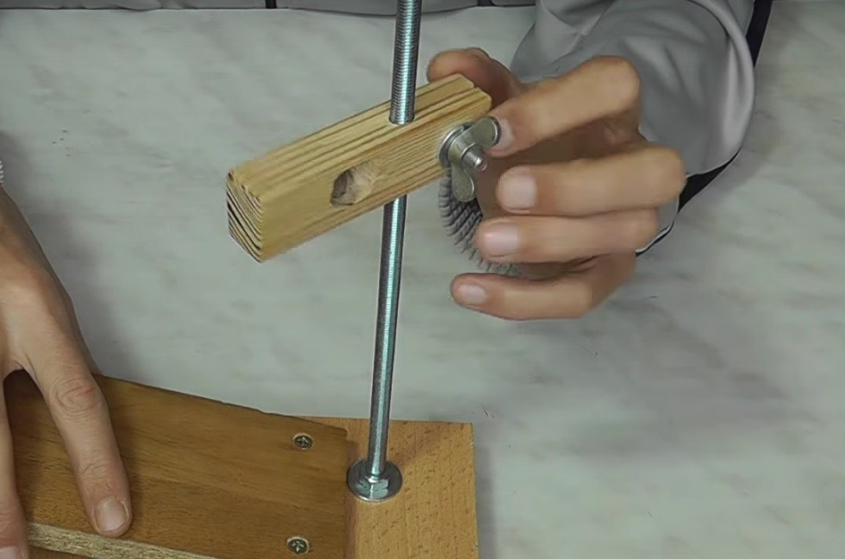 После того, как брусок и основание будут надёжно скреплены, предстоит вставить шпильку М8 в отверстие в бруске. Шпилька должна проходить по всему сечению бруска и основания; таким образом риск изменения её положения сводится к минимуму. Шпильку у основания бруска нужно жёстко зафиксировать гайкой М8, слегка утопив её при закручивании в древесине бруска.