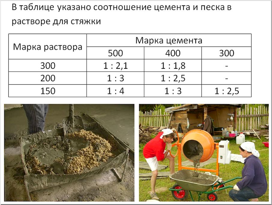 Пропорции цемента и песка для стяжки пола, а также количество дополнительных веществ следующее: