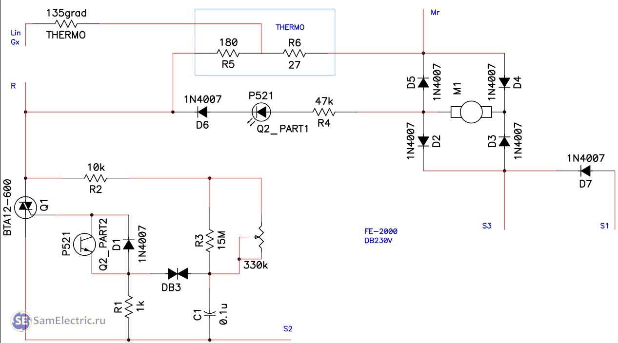 Следующая электрическая схема строительного фена рис.3, — сопоставима с электрической схемой рис.1