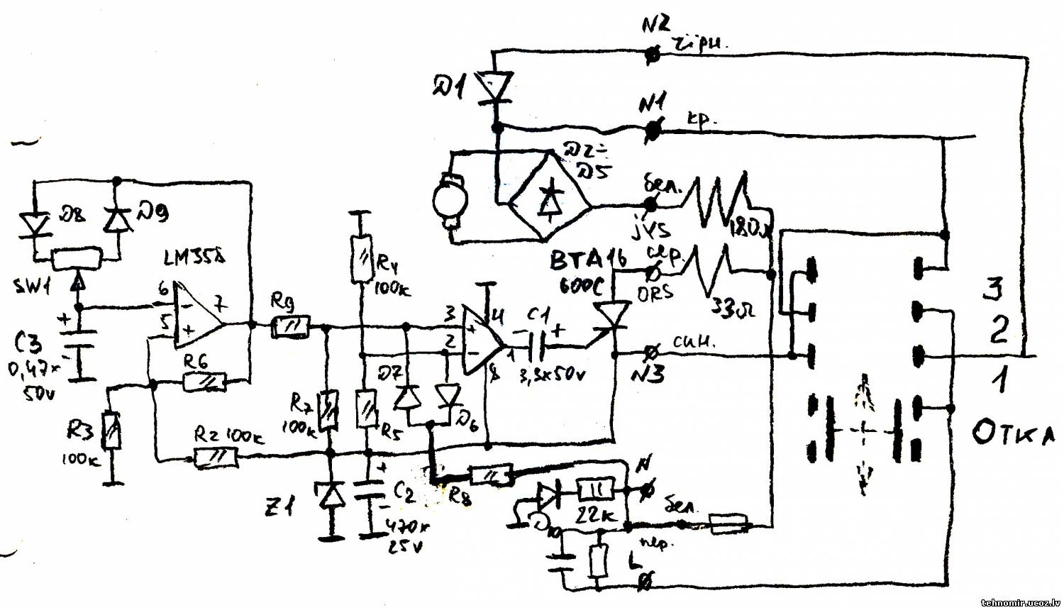 В данной электрической схеме отсутствует диодный мост. Управление скоростью обдува и управление температурным режимом, — происходит при переключении из одного участка электрической цепи на другой, а именно: