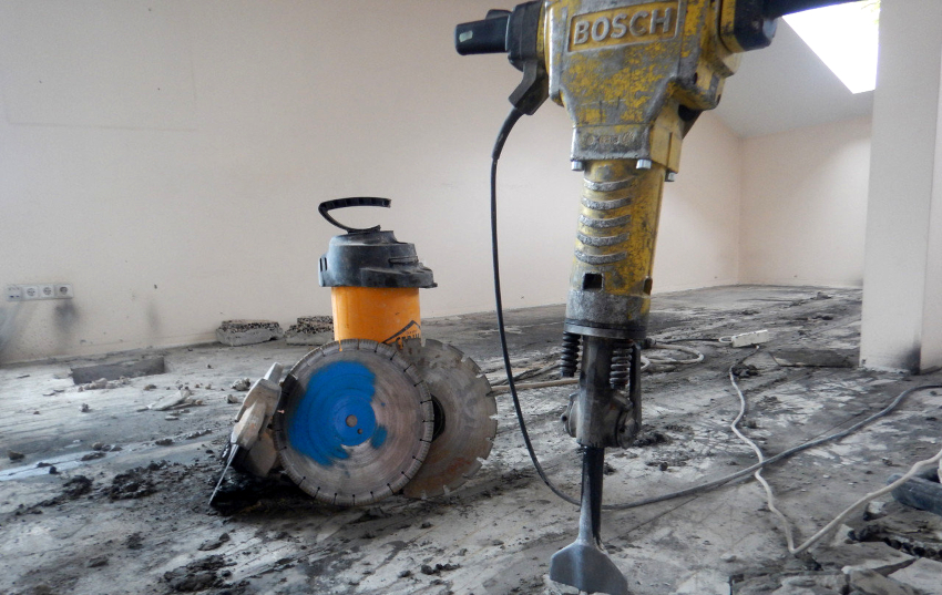 Если толщина стяжки пола в квартире превышает 3 см, а также в случае ее армирования стальной сеткой, демонтаж основания выполняется с привлечением специальных агрегатов. Для этих целей подойдут пневматический отбойный молоток, перфоратор высокой мощности с насадкой в форме лопатки или пики, дисковая пила с алмазным диском, предназначенным для работы по железу и камню.