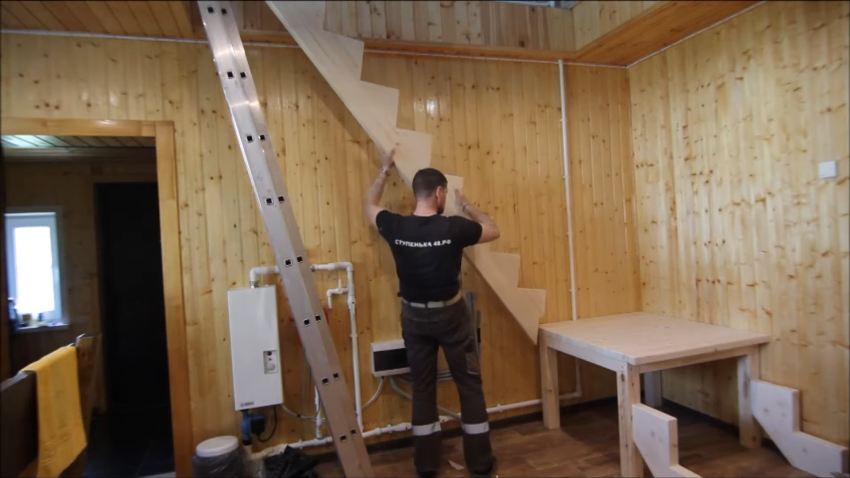 В остальном конструкция напоминает маршевую. Несущие составляющие – тетивы. Для этого потребуется две деревянные доски толщиной более 50 мм. Высота ступеней может составлять 15 мм. Исходя из этих параметров, следует рассчитать число ступеней, определяя угол наклона, допустим, 65 градусов.