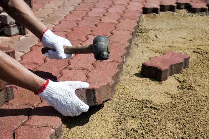 Утрамбовка тротуарной плитки с использованием мокрого песка.
