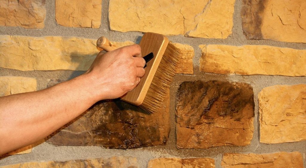 При нанесении лака на гипсовую поверхность плитки, фактурный рисунок выделяется до мелочей. Данное средство проникает в структуру рисунка, высыхает, повторяет все точки и полоски кирпича или камня.