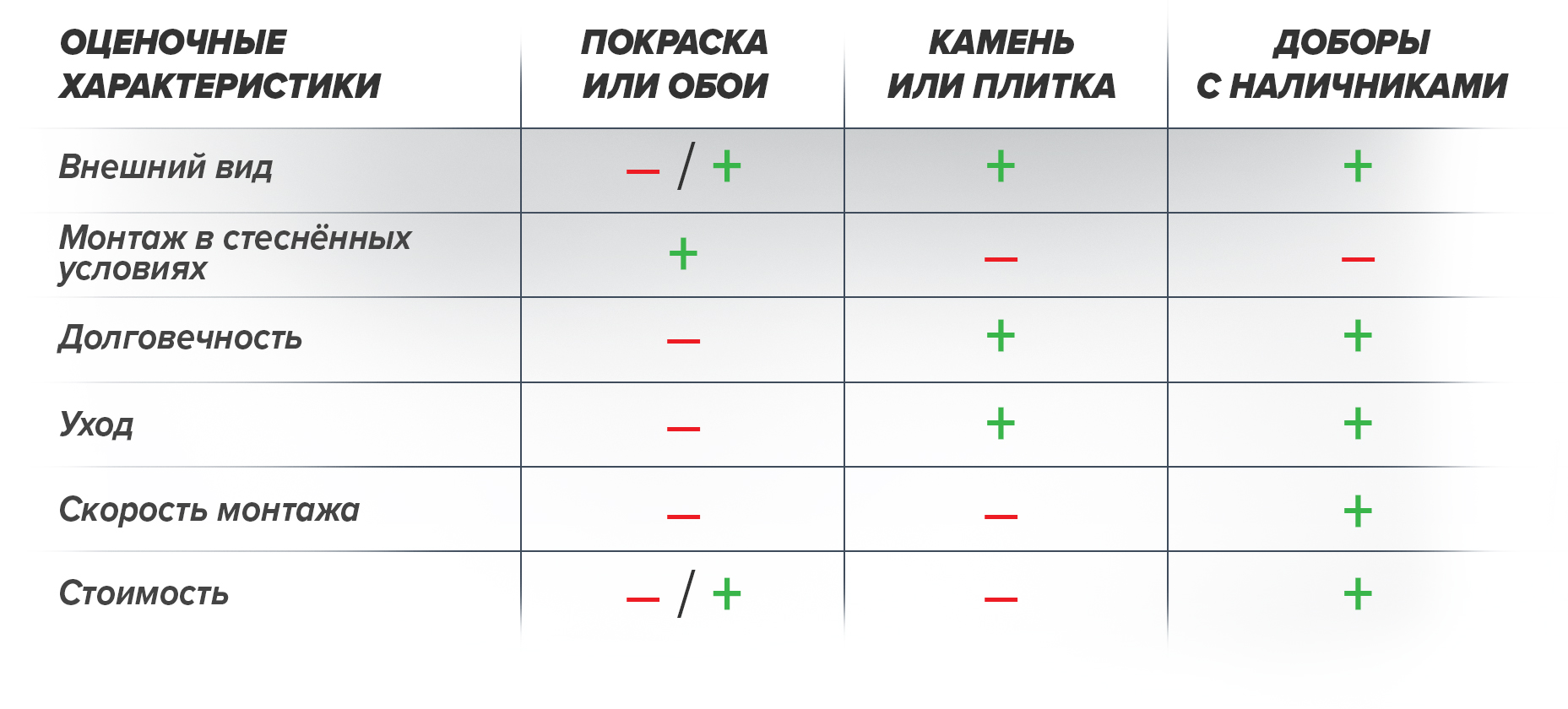 Чтобы ещё более упростить выбор отделочной технологии, мы составили сравнительную таблицу. Знаки «+» или «-» – примерный уровень достоинств или недостатков по основным характеристикам.