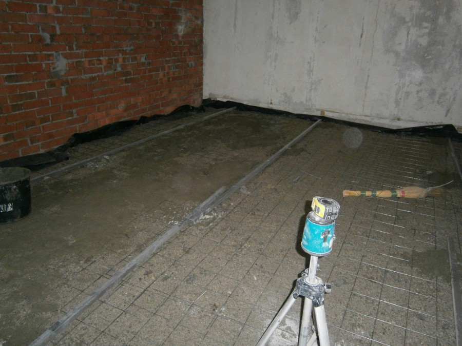 От того, как точно выставлен нулевой уровень стяжки, зависит, насколько ровным будет пол в итоге. Для этих целей используют лазерный или водяной уровни. Процесс начинают с первой метки на высоте 1,2-1,5 м от пола, которую с помощью вышеперечисленных измерительных инструментов переносят на каждую стену помещения. В результате получают множество отметок, расположенных строго на одном уровне относительно горизонта (а не относительно существующего пола), которые затем необходимо соединить горизонтальной линией.