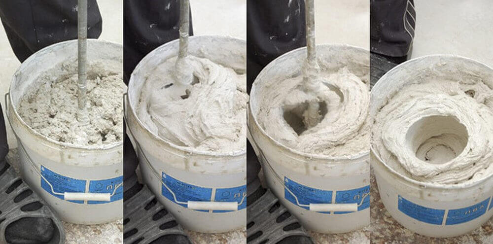 В большинстве случаев используются готовые составы для оштукатуривания, но можно приготовить материал из сухой смеси. Следуя инструкции на упаковке, состав заливают водой, перемешивая с помощью дрели, оснащенной специальной насадкой.