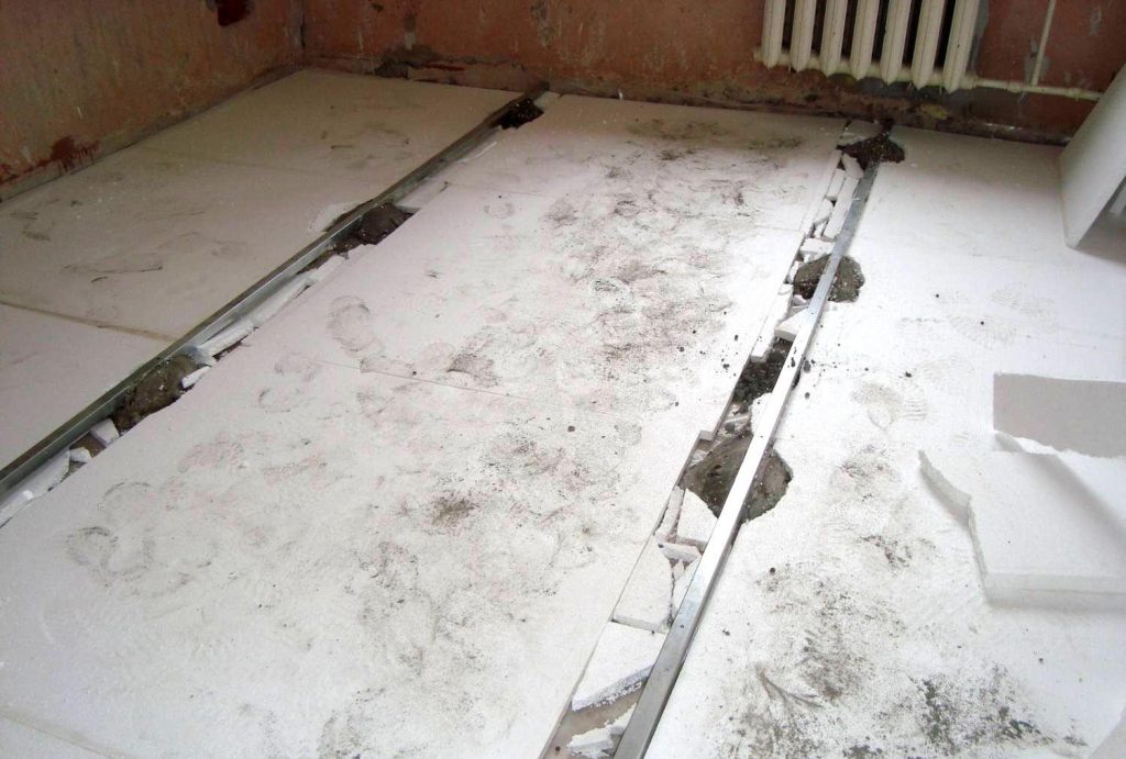 Подготовка маяков высот и направляющих. Они требуются, чтобы ровно уложить засыпку, которая выровняет перепады высот основного пола. Рейки укладываются на пол и выравниваются с помощью уровня и правила.