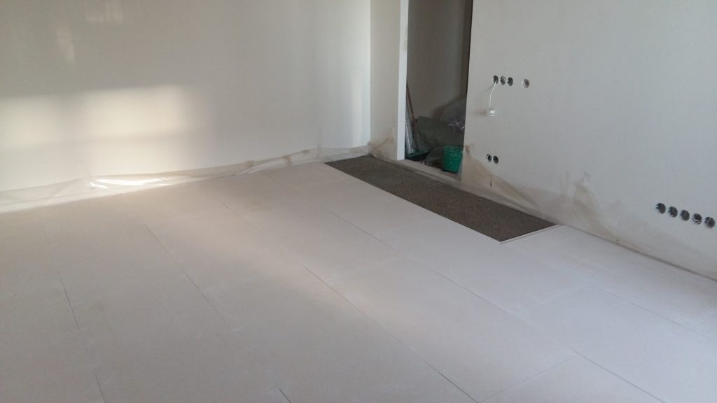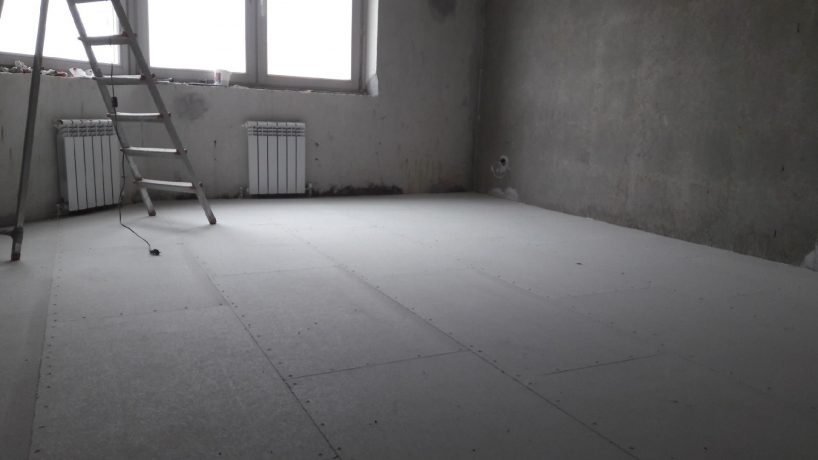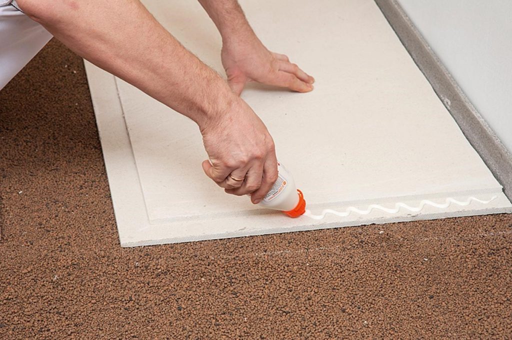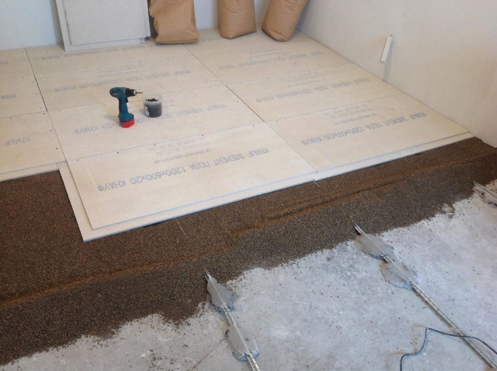 Пол Кнауф состоит из двух основных компонентов – сухой засыпки и листов из гипсоволокна. Последние изготавливают на заводах посредством прессования и склеивания. Они имеют малоформатные размеры и укладываются вплотную друг к другу. Швы скрепляются при помощи специального клея и саморезов. В результате пол представляет собой ровный цельный лист.