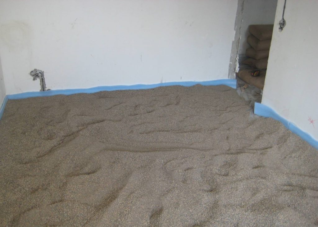 Сухая стяжка выравнивает незначительные перепады уровня основания и распределяет механическую нагрузку. Сыпучая прослойка выполняется из керамзитового песка и гравия с максимально малым объемным весом, для песка это фракция 0…5 мм, для гравия фракция 5…10 мм.
