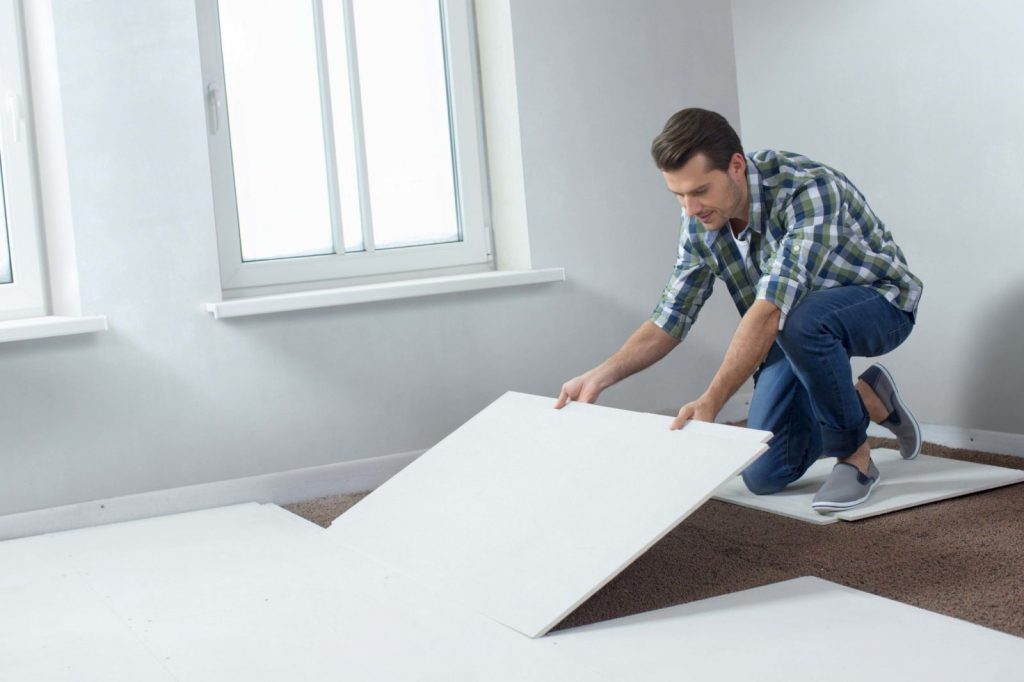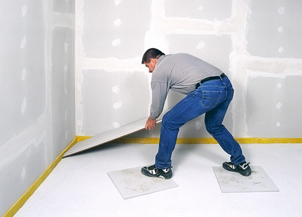- Монтаж листов ГВЛ должен происходить от противоположной к полу стены. К ней нужно постелить дорожку из ГВЛ, чтобы можно было передвигаться, не деформируя засыпку.