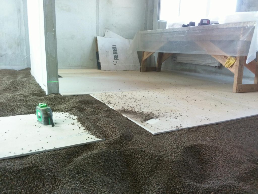 - Заполнение пустот мелким керамзитом, (его приобретают отдельно у другого производителя или применяют засыпку от Кнауф). Чтобы уменьшить количество перемещений по насыпанному слою, засыпку начинают с дальнего (противоположного) от двери угла.