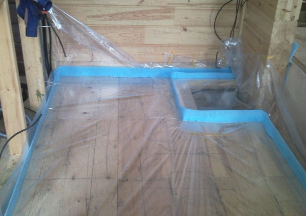 - На пол укладывается пароизоляционная пленка. Если вы используете не цельный материал, а несколько частей, то нахлест полотен друг на друга должен составлять 20 см.