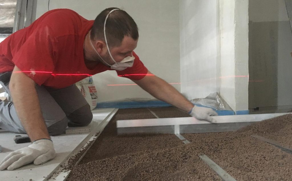 - Между маяками засыпается керамзит и выравнивается с помощью правила. Маяки удаляются, а канавки от них, закрываются той же засыпкой.