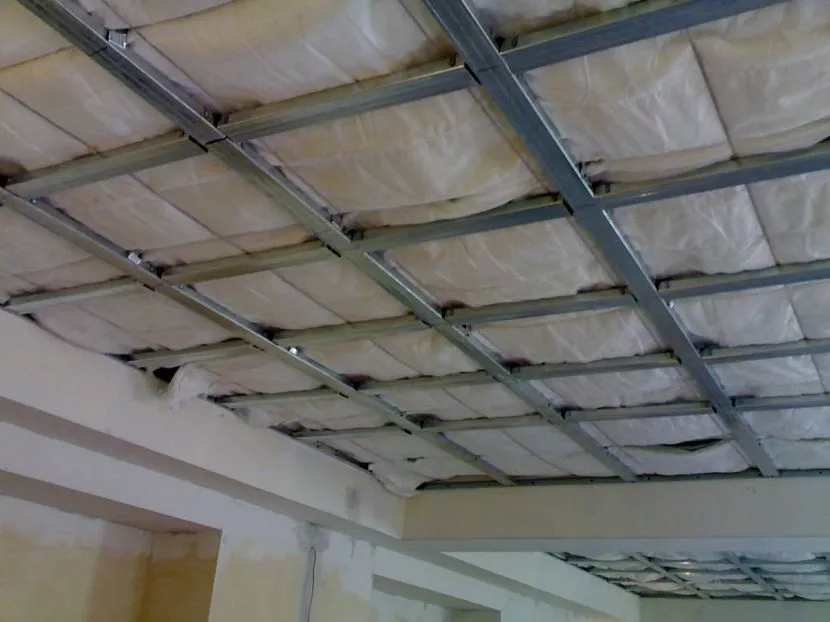 Когда звукоизолирующие одеяла натянуты, можно приступать к монтажу самого потолка.