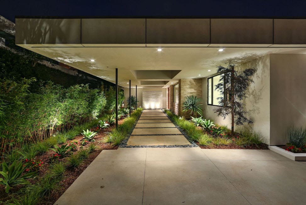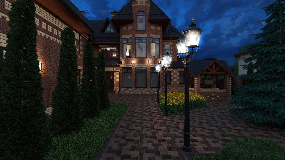Для общего освещения достаточно хорошей подсветки на веранде здания и пары светильников возле гаража, если он есть. Если нет, пару фонарей закрепляют вокруг парковочной площадки.