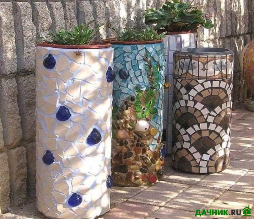 Украсить вазоны можно камнями, галькой, ракушками и подобным. Также можно оформить вазоны мозаичным покрытием. Делается это с помощью битого стекла разного цвета, осколков фарфора (к поверхности их крепят плиточным клеем, на небольших площадях – прозрачным строительным клеем).