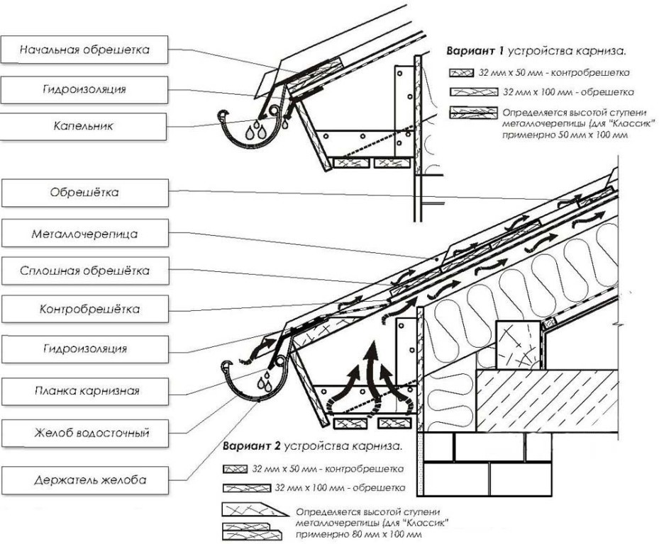 Созданная таким методом дистанция позволяет воздушному потоку войти в зоне карниза и выйти в области конька, прихватив с собой конденсат и осевшую под кровлей влагу.