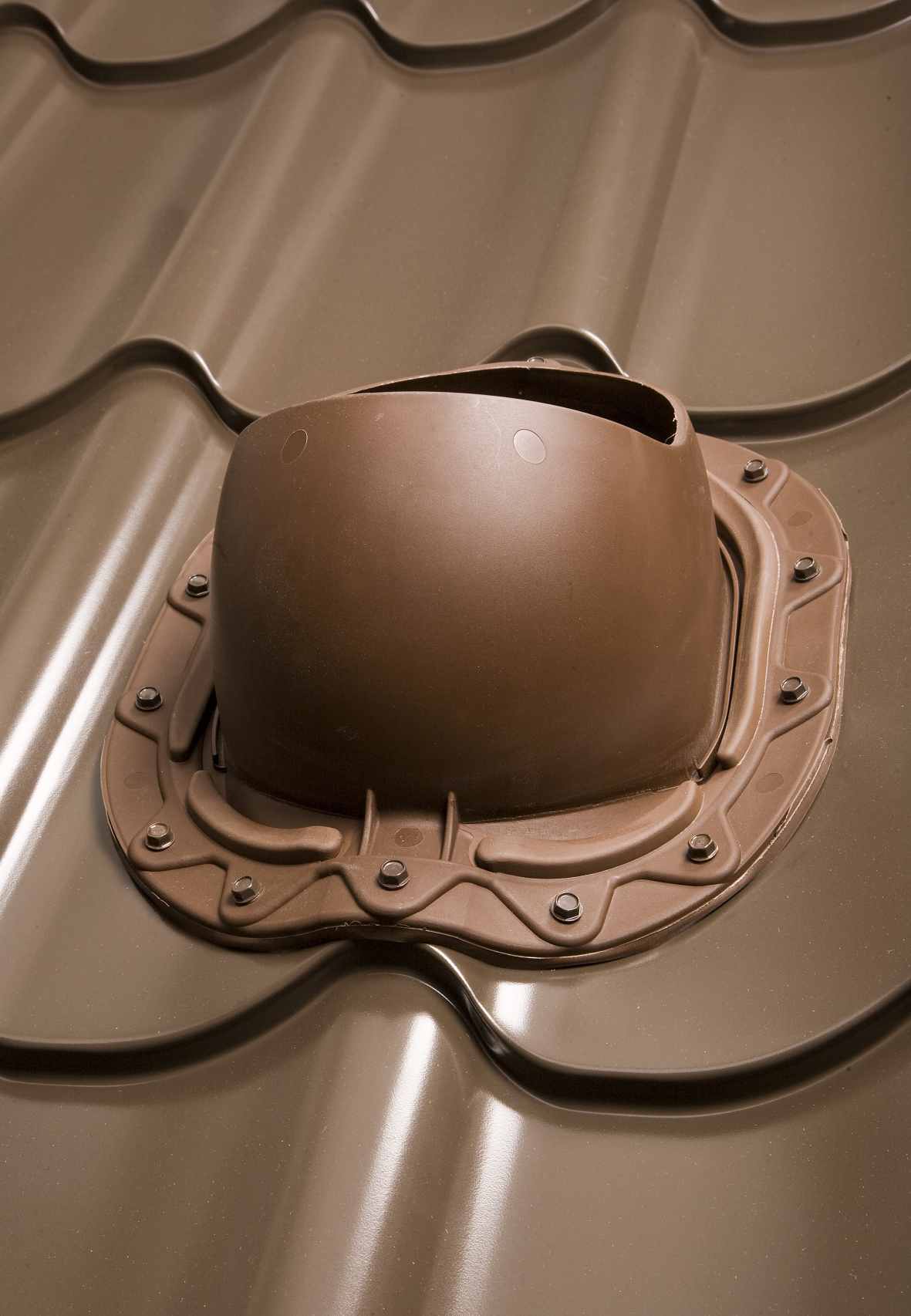 Вентиляционные трубы – элемент по принципу действия схож с КТВ. При этом он может подключаться к внутренней вентиляционной системе дома и обеспечивать выход влаги и отработанного воздуха не только из кровельного «пирога», но и из мансарды, канализационных стоков, печей и каминов, ванных комнат и других помещений. На трубу устанавливается сетчатый фильтр и защитный зонтик, которые предохраняют этот элемент от попадания мусора. В основание укладывается фартук, который обеспечивает герметичное примыкание к поверхности крыши.