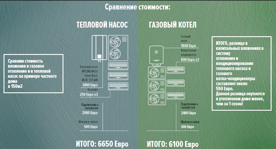 - При росте объемов отапливаемого пространства технологические параметры теплонасоса увеличиваются почти в геометрической прогрессии. Становятся габаритнее теплообменники, размер и количество зондов погружения в воду или землю увеличиваются. В определенной точке стоимость теплонасоса для отопления, необходимые траты на его монтаж и обслуживание, а также оплату потребленной мощности становятся просто нерациональными вложениями. Гораздо дешевле создать классическую газовую схему отопления с котлом.