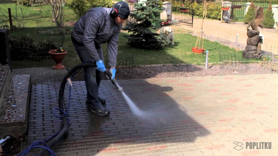 Летом тротуарную плитку очищают от пыли, грязи с помощью щеток и воды, подаваемой под напором. Для устранения сложных загрязнений используют следующие способы: