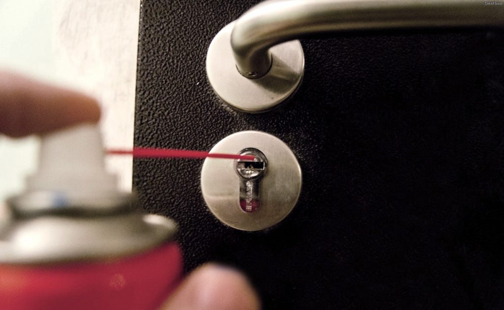 - Стоит попробовать смазать заклинивший замок с помощью машинного масла, керосина или специального спрея WD-40. Жидкость вводят в замочную скважину с помощью обычного медицинского шприца либо при помощи тонкой насадки на баллончике со спреем. После этого ключ снова вставляют в скважину и несколько раз проворачивают, не выполняя проворот до конца.
