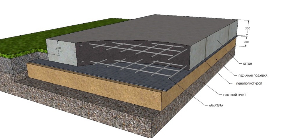 Высота плиты зависит от будущей нагрузки и грунтовых вод.