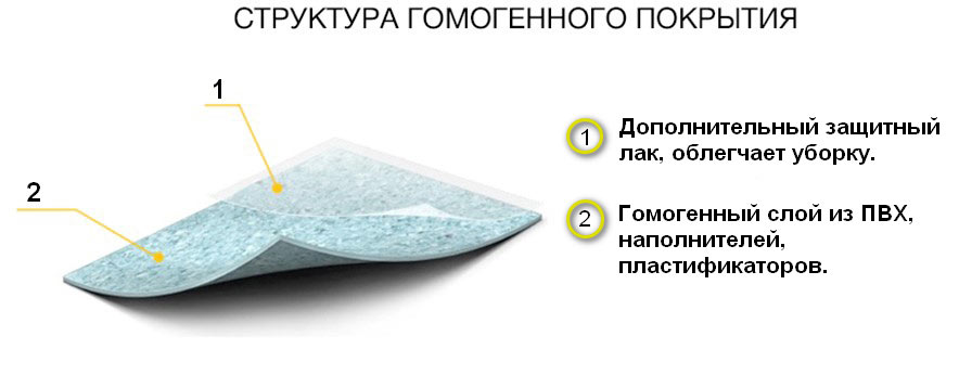 - Гомогенный. Выполнен из одного плотного слоя и имеет вспененную основу. Рисунок проходит насквозь. Обычно используется для помещений промышленной направленности, так как имеет ограниченное количество рисунков и цветов.