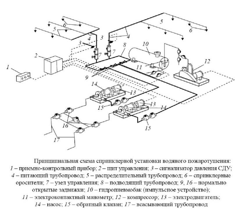 - Питающий трубопровод соединяет узел управления с распределительной трубопроводной сетью, смонтированной в защищаемых помещениях объекта, на которой установлены спринклерные водяные или пенные оросители.