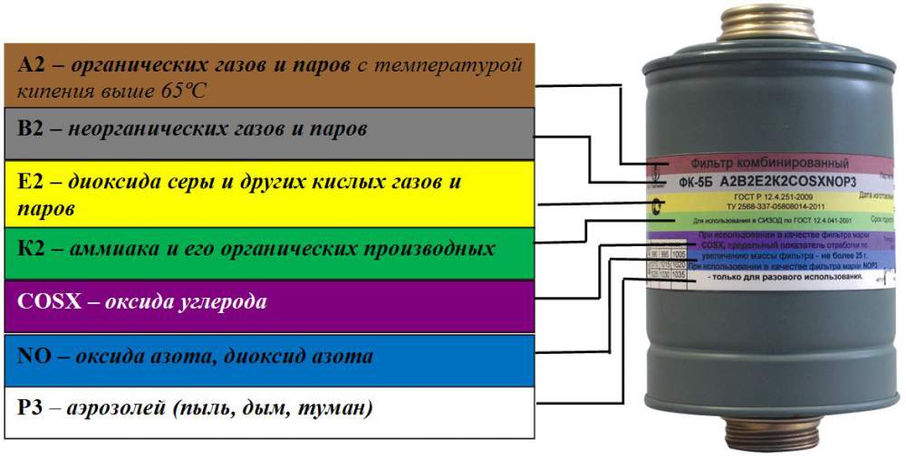 Маркировка промышленных противогазов отличается от гражданских. Для классификации используют буквенно-цифровой код и цветную маркировку, которые указывают на тип вредных веществ и уровень защиты.