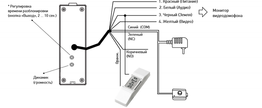 Для выполнения установки требуется правильная схема подключения. В основном на внешнем блоке и на видеодомофоне все контакты клемм имеют цветовую кодировку или пронумерованы. Цвета монитора и вызывной панели могут отличаться.