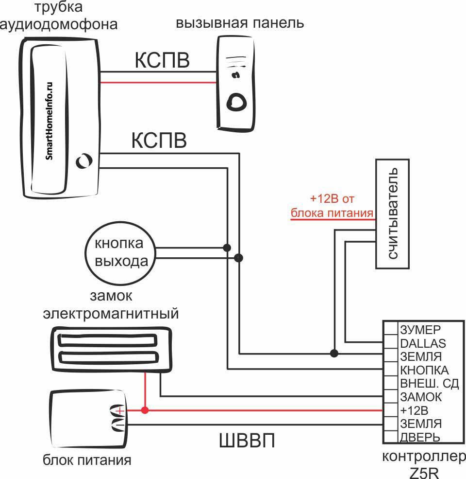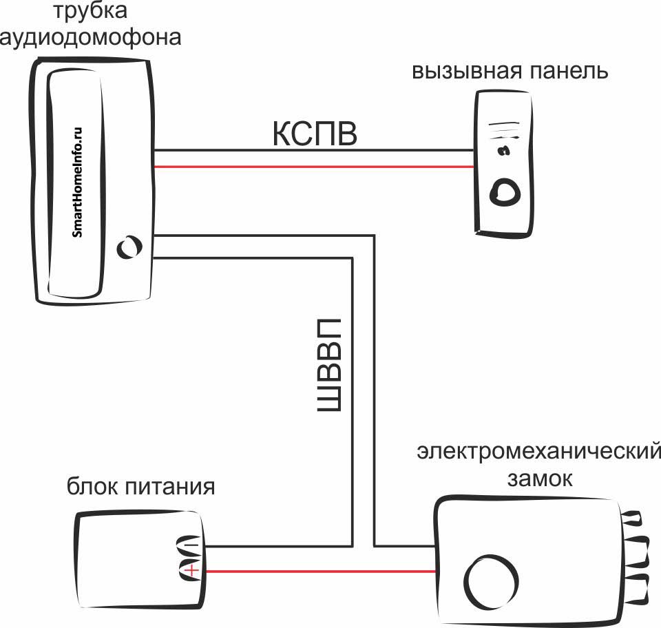 Схема подключения аудиодомофона с электромагнитным замком выглядит следующим образом: