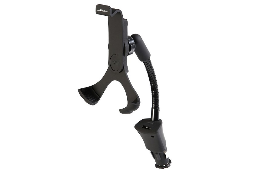 Интересный вариант, вставляющийся в прикуриватель. Кронштейн гибкий и легко принимает нужное положение. Держатель трёхточечный и надёжно фиксирует телефон. На площадке головки размещена накладка из резины.