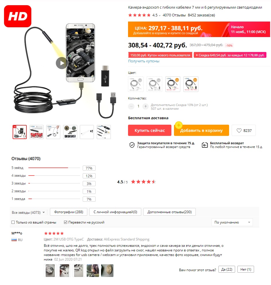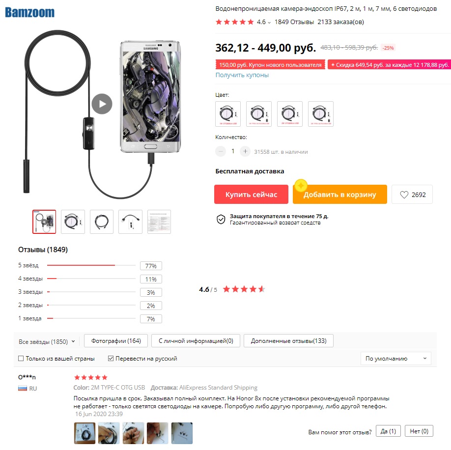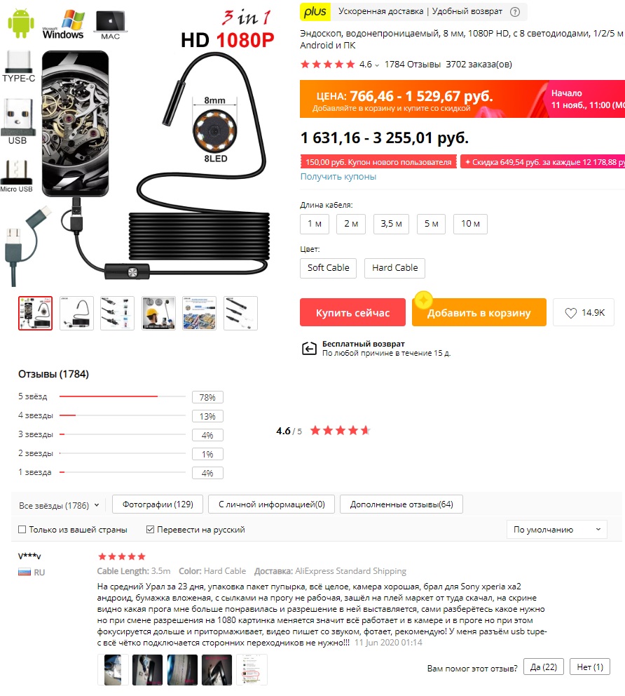 К телефону или компьютеру устройство подключается быстро, но для некоторых смартфонов требуется дополнительный переходник. Его придется докупить заранее на АлиЭкспресс или в другом магазине. К недостаткам эндоскопа относят то, что камера греется из-за встроенных светодиодов. Не стоит подолгу держать ее включенной, оптимальное время непрерывного использования – 2 минуты. Если предмет находится на расстоянии 4 см (и ближе) от объектива, есть риск расфокуса. Придется потратить время, чтобы найти подходящий угол обзора.