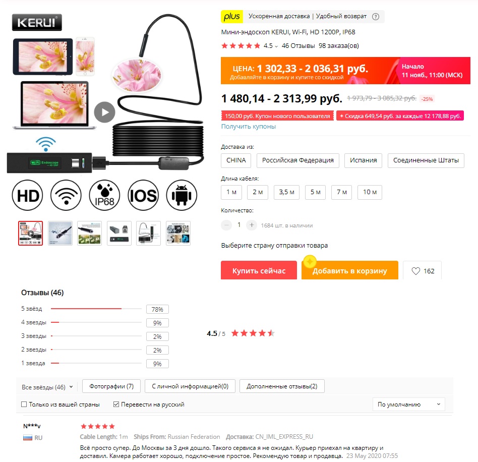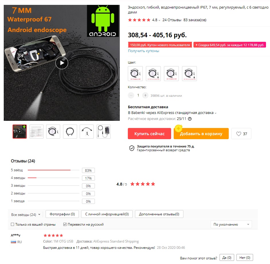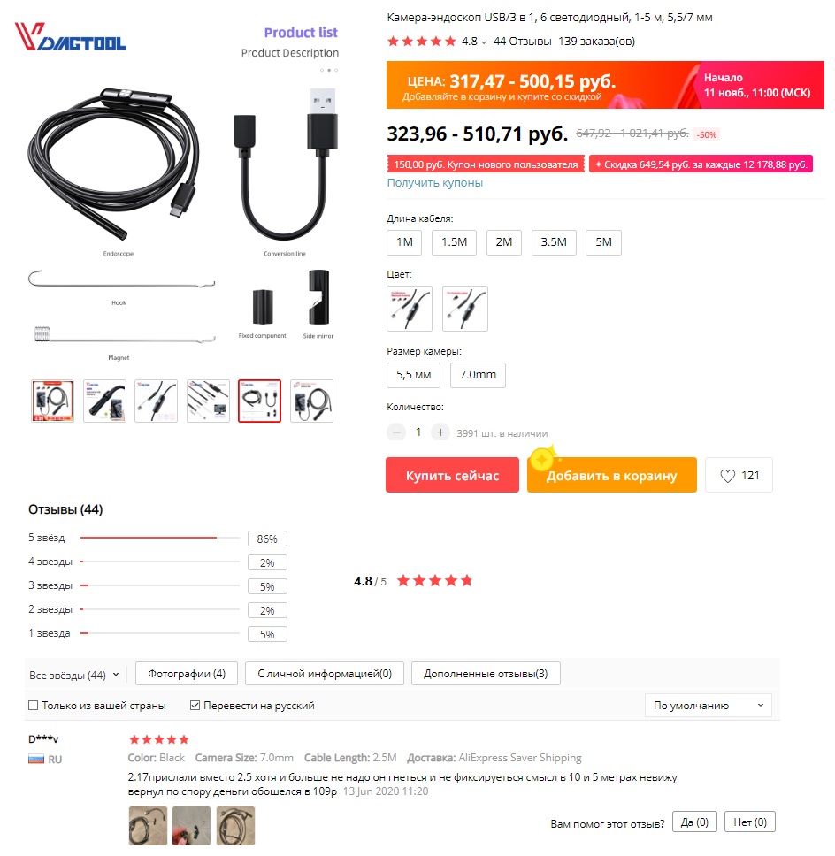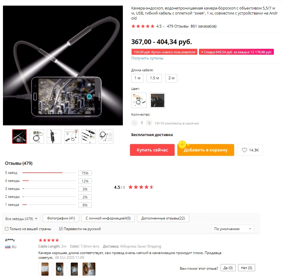 Обнаружить эндоскоп непосредственно в какой-либо категории каталога Алиэкспресс может быть затруднительно. Его можно отнести и к мобильной технике, и к видеоаппаратуре, а также к аксессуарам. Поэтому оптимальным способом обнаружения искомого товара является использование поисковой строки.
