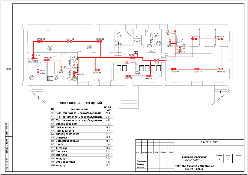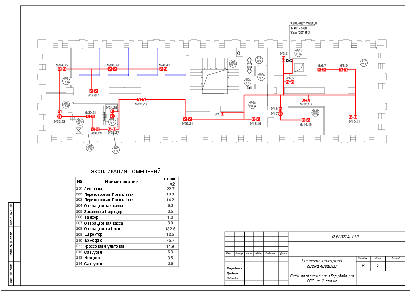 Система строится на адресно-аналоговых извещателях «ДИП-34А-01-02» подключаемых через контроллеры двухпроводной линии связи «С2000-КДЛ» №8,9,10,11, которые осуществляют непрерывный контроль состояния шлейфов пожарной сигнализации и передают информацию по последовательному интерфейсу RS-485 на ПКУ «С2000М» и персональный компьютер с АРМ «Орион» (учтены в проекте 09/2014 СОТС). ![]()